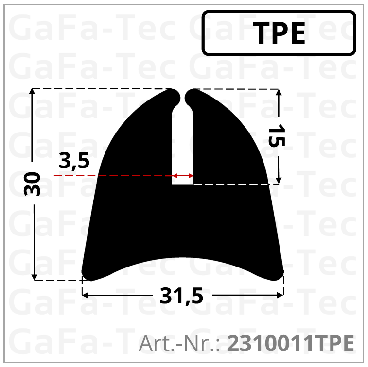 TPE U-Pufferprofil, KB 3,5 mm, 31,5x30 mm, schwarz 2310011TPE Mengeneinheit (m) Meter + – Mengeneinheit: (m) Meter Artikelnummer Mindestfertigungsmenge 2310011TPE 25 lfm Bauzeit Extrusionswerkzeug Aktuelle Fertigungszeit keine / vorhanden ca. 2-3 Wochen Die Dauer bis zum Warenausgang ergibt sich aus der Bauzeit für das Extrusionswerkzeug und der Fertigungszeit. Farbgebungsoptionen Standard-Schwarz │ Optional in FARBE TPE-S U-Pufferprofil • U-Rammschutzprofil, Klemmbereich 3,5 mm, 31,5x30 mm, schwarz Gummielastisches Profil aus einem thermoplastischen Styrol-Blockcopolymer