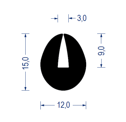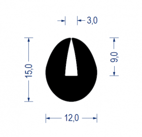 epdm, moosgummi, u-rundprofil, durchmesser 12x15 mm, schlitz-klemmbereich 3,0mm, schwarz, artikelnummer 2120012