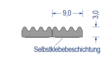 epdm, moosgummi, riefenprofil, kronenprofil, doppelmeter mit abrißkante, 3x9mm, grau, selbstklebend, artikelnummer 2170002