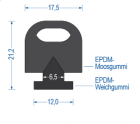 EPDM-Koextrusionsprofil 17,5x21,2 mm, Fuß 12 mm, Steg 6,5 mm, schwarz