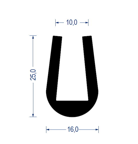 Sortiment Profile Gummi-Profile aus Vollgummi U-Pufferprofile Gummi U-Pufferprofil, KB 10 mm, 16x25 mm, EPDM 45° Sh.A., schwarz