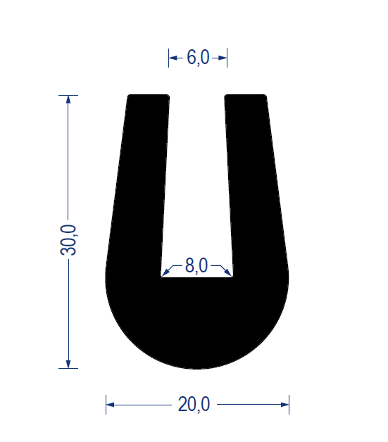 Sortiment Profile Gummi-Profile aus Vollgummi U-Pufferprofile Gummi U-Pufferprofil, KB 6-8 mm, 20x30 mm, EPDM 65° Sh.A., schwarz