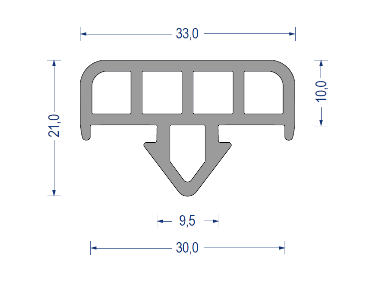 Sortiment Profile Gummi-Profile aus Vollgummi Glasauflageprofile • Polsterprofile Polsterprofil, Fassung 9,5 mm, Auflage 33 mm, PVC 70° Sh.A, grau