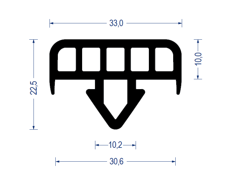 Sortiment Profile Gummi-Profile aus Vollgummi Glasauflageprofile • Polsterprofile Glasauflageprofil, Fassung 10,2 mm, Auflage 33 mm, EPDM 60° Sh.A, schwarz