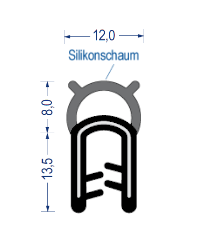 silikon kantenschutz-profil, mit silikonschaum-dichtprofil oben, klemmbereich 1-3mm, schwarz, 21,5x12mm, mit eingebettetem metallklemmdraht, artikelnummer 2770014