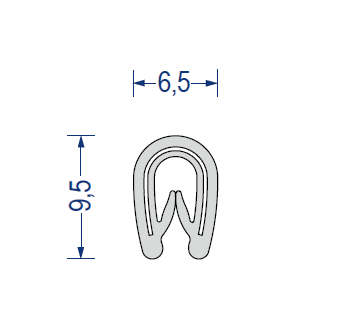 weich-pvc kantenschutz-profil, klemmbereich 1-2mm, silber, 9,5x6,5mm, mit eingebettetem metallklemmband, artikelnummer 2800005