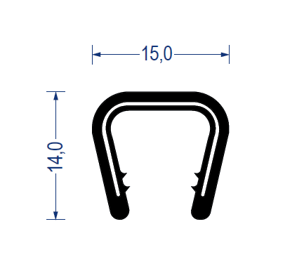 weich-pvc kantenschutz-profil, klemmbereich 8-10mm, schwarz, 14x15mm, mit eingebettetem metallklemmband, artikelnummer 2800025