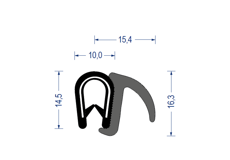 weich-pvc kantenschutzprofil, mit epdm-moosgummi dichtprofil seitlich, klemmbereich 1-4mm, schwarz, 14,5x15,4mm, mit eingebettetem metallklemmband, artikelnummer 2810001