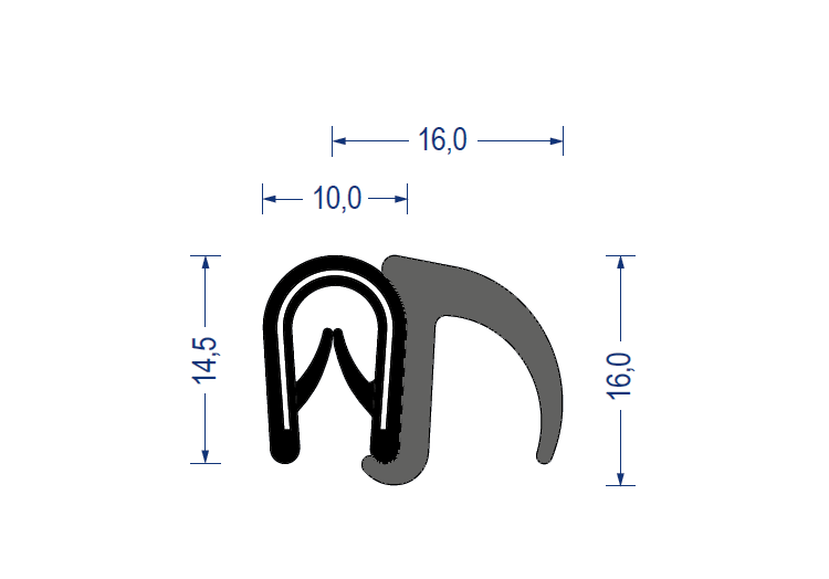 weich-pvc kantenschutz-profil, mit epdm-moosgummi dichtprofil seitlich, klemmbereich 1-4mm, schwarz, 14,5x16,0mm, mit eingebettetem metallklemmband, artikelnummer 2810004