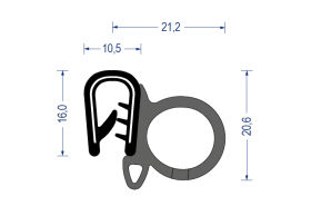 weich-pvc kantenschutz-profil, mit epdm-moosgummi dichtprofil seitlich, klemmbereich 2,5-4mm, schwarz, 16x21,2mm, mit eingebettetem metallklemmband, artikelnummer 2810008