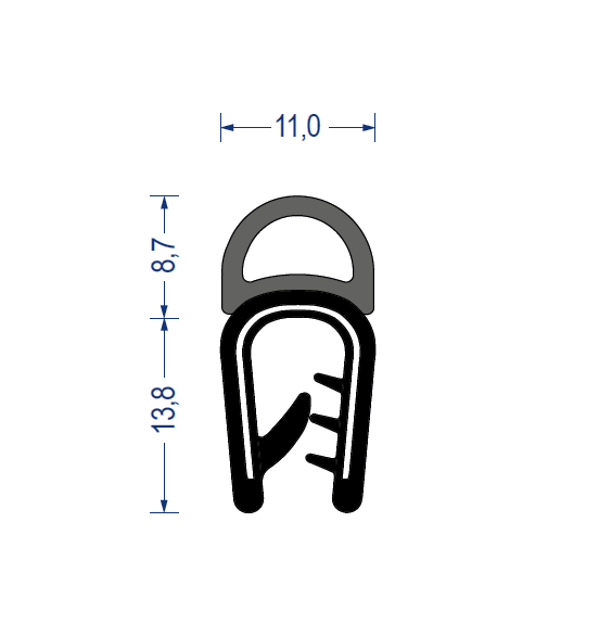 weich-pvc kantenschutzprofil, mit epdm-moosgummi dichtprofil oben, klemmbereich 4-6mm, schwarz, 22,5x11mm, mit eingebettetem metallklemmband, artikelnummer 2810015