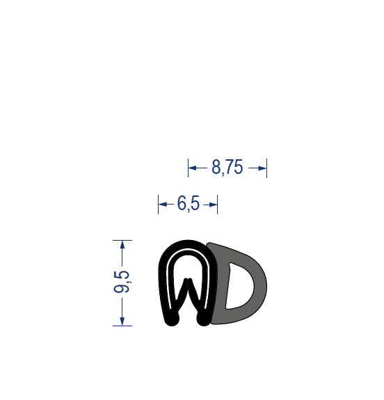 Sortiment Profile Kantenschutz-Profile │ Weich-PVC • EPDM-Gummi • Silikon Weich-PVC Kantenschutz-Profile mit Dichtprofil aus EPDM-Moosgummi Weich-PVC Kantenschutz-Profil mit EPDM-Moosgummi Dichtprofil seitlich, KB 1 - 2 mm, schwarz (9,5x8,75 mm) mit Metallklemmband