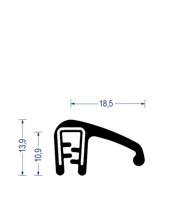 epdm gummi kantenschutzprofil, mit epdm-vollgummi-dichtlippe seitlich, klemmbereich 1-3mm, schwarz, 13,9x18,5mm, mit eingebettetem stahlklemmband, artikelnummer 2820005