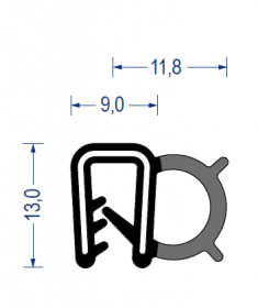 epdm gummi kantenschutz-profil, mit epdm-moosgummi dichtprofil seitlich, klemmbereich 2mm, schwarz, 13x11,8mm, mit eingebettetem metallklemmband, artikelnummer 2830004