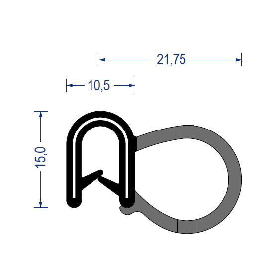 cr gummi kantenschutz-profil, mit cr-moosgummi dichtprofil seitlich, klemmbereich 1-3,5mm, schwarz, 15x21,75mm, mit eingebettetem metallklemmband, artikelnummer 2830016