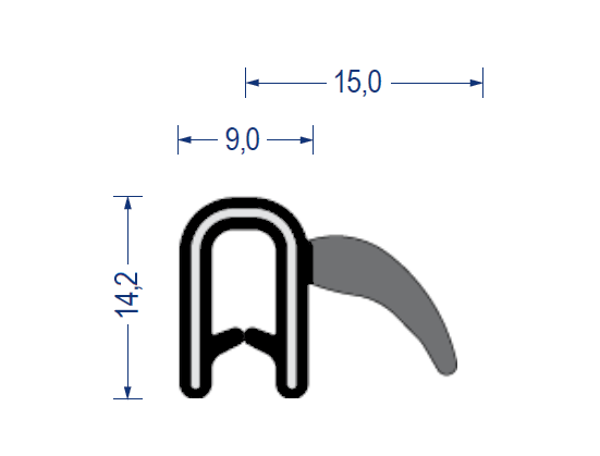 epdm gummi kantenschutzprofil, mit epdm-moosgummi dichtlippe seitlich, klemmbereich 1-3mm, schwarz, 14,2x15mm, mit eingebettetem metallklemmband, artikelnummer 2830037